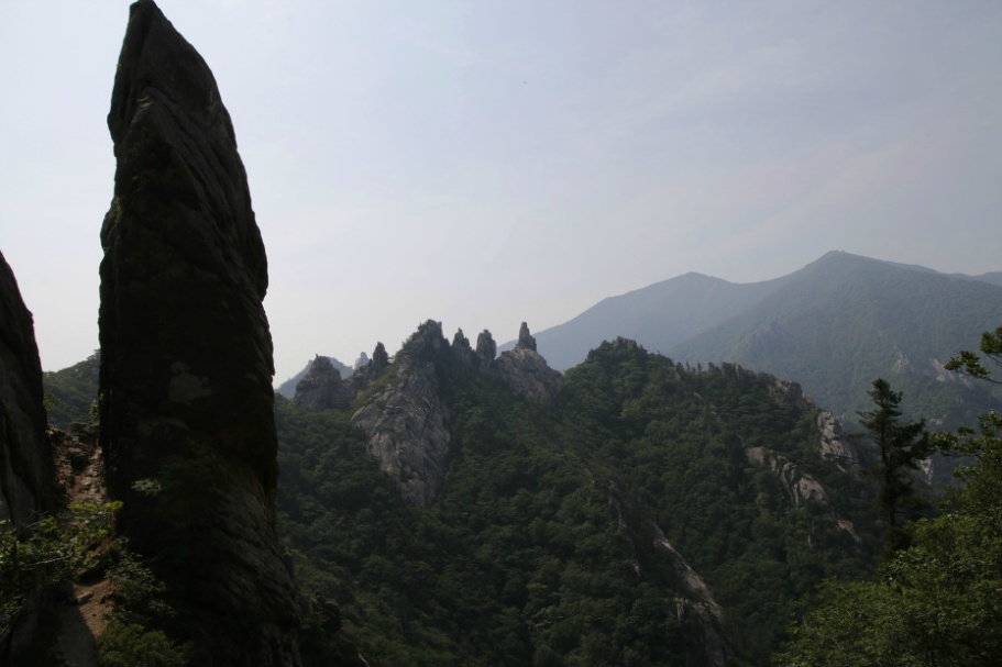 돌아서 뒤를 보니 기둥바위 뒤로 천화대 뾰족한 봉우리들이 꽃밭을 이루고 있다.