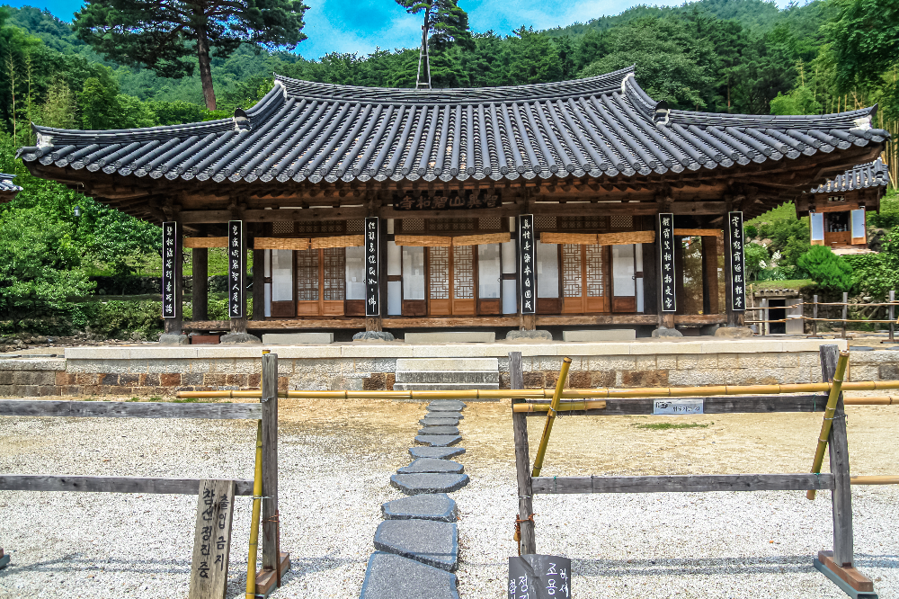 뒷산은 푸른 소나무가 병풍처럼 둘러싸고 있다.